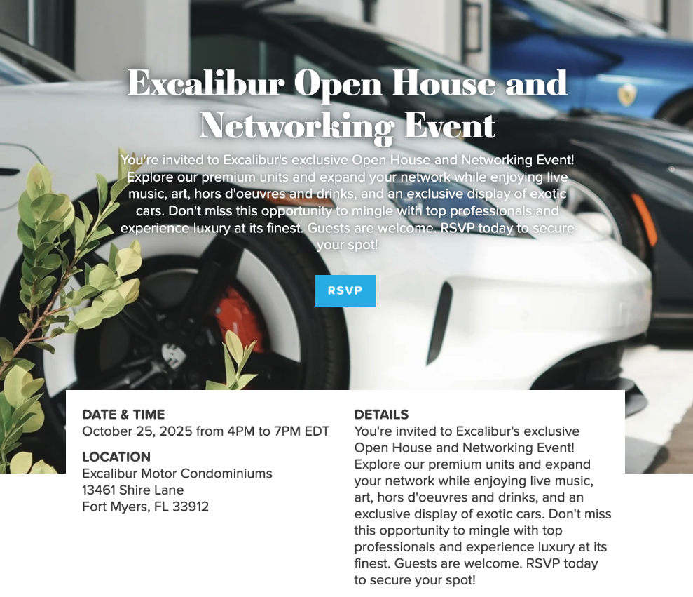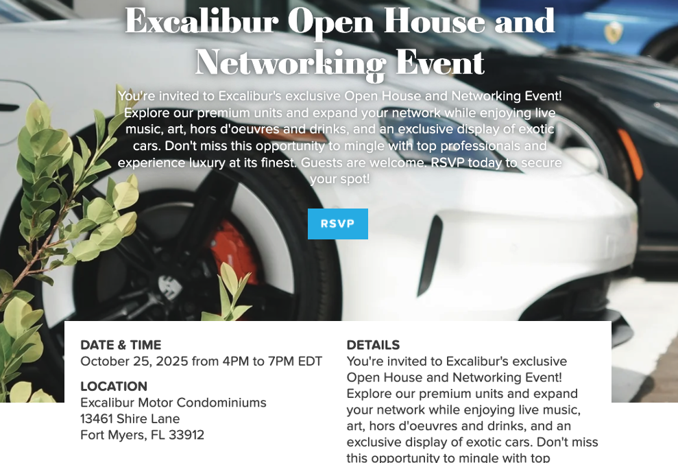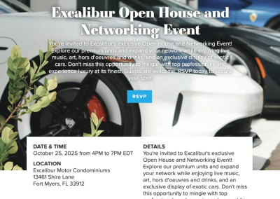 You’re invited to Excalibur’s exclusive Open House and Networking Event! Explore our premium units and expand your network while enjoying live music, art, hors d’oeuvres and drinks, and an exclusive display of exotic cars. Don’t miss this opportunity to mingle with top professionals and experience luxury at its finest. Guests are welcome. RSVP today to secure your spot!