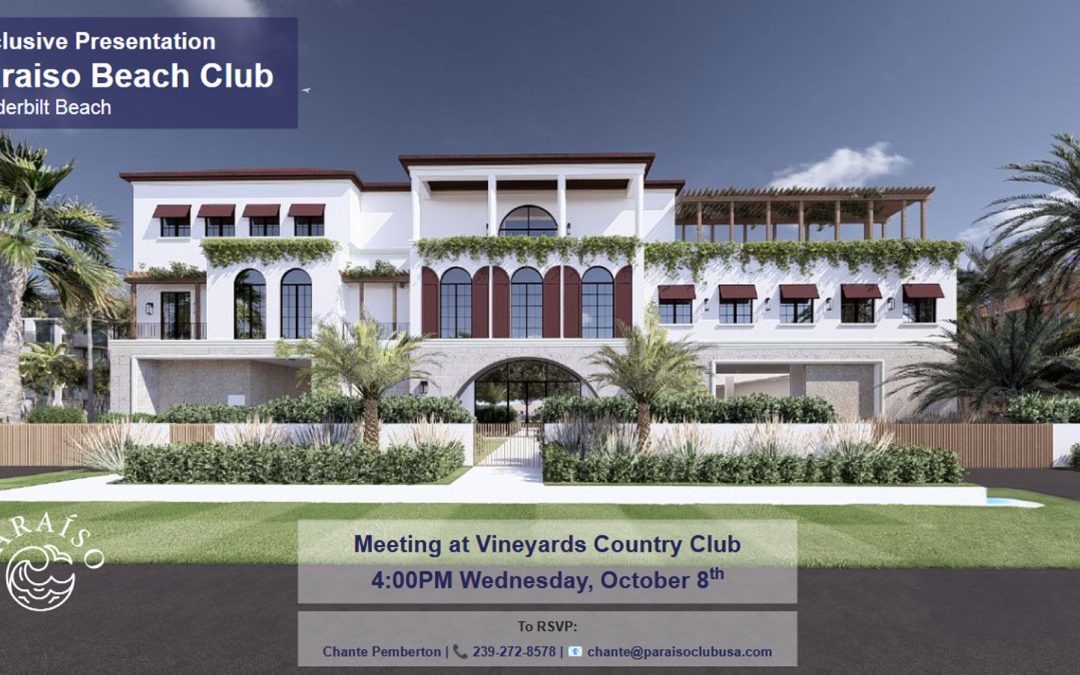 Paraiso Beach Club cordially invites you to an exclusive presentation of a private membership opportunity at the Paraiso Beach Club on Vanderbilt Beach.